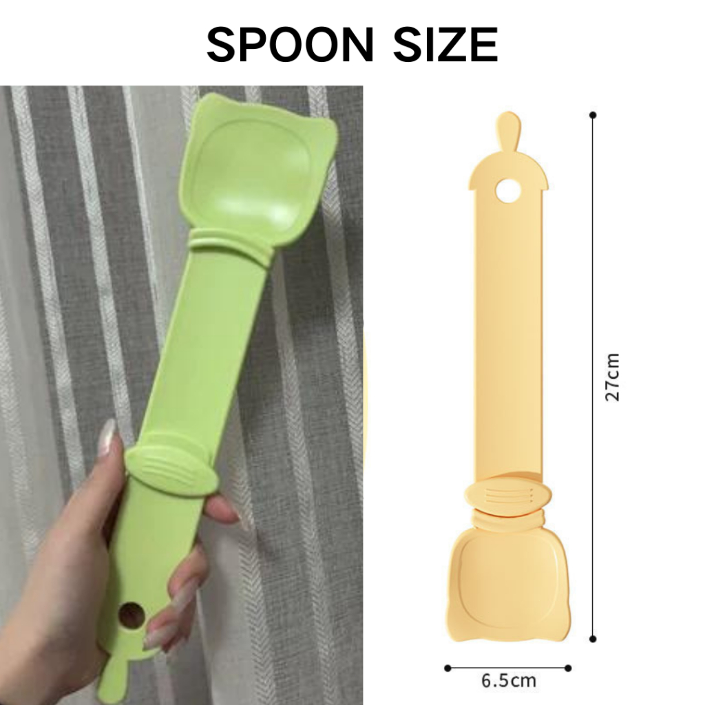 Quality:good Suitability:good Appearance:good Bought one earlier and found it super useful. The front part can be pressed down like a seal for opened stick puree treats. The spoon is great for preventing my greedy cats from biting through the pack and potentially the fingers of my visitor feeders haha
