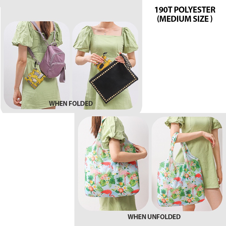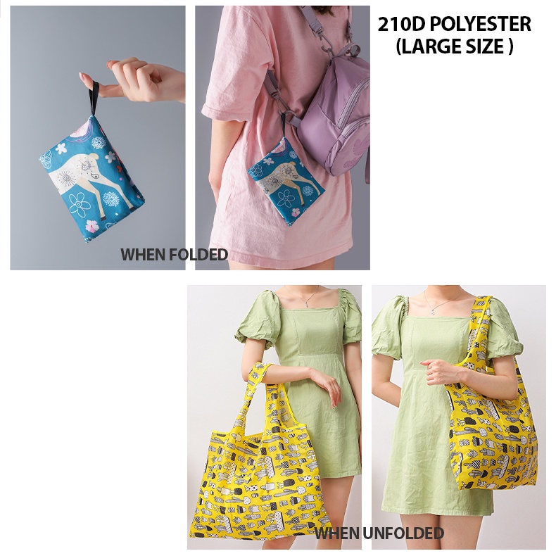 Colour:Marine Blue, salmon pink, pale orange. Material Quality:Polyester bag ? The foldable polyester bag has a "small pouch" at centre top =➡️ that allows the entire bag to be folded & slotted into this pouch. ( ? see video for steps on folding) ?Product code = DM-07 / Medium Size ?Bottom = 46 cm ? Length = 60cm ? It's just a well-balanced size for carrying groceries & snacks etc when you are shopping at a supermarket.✅️ It's neither too big nor too small. ☑️刚刚好。