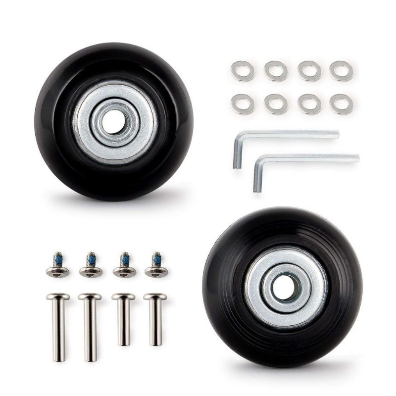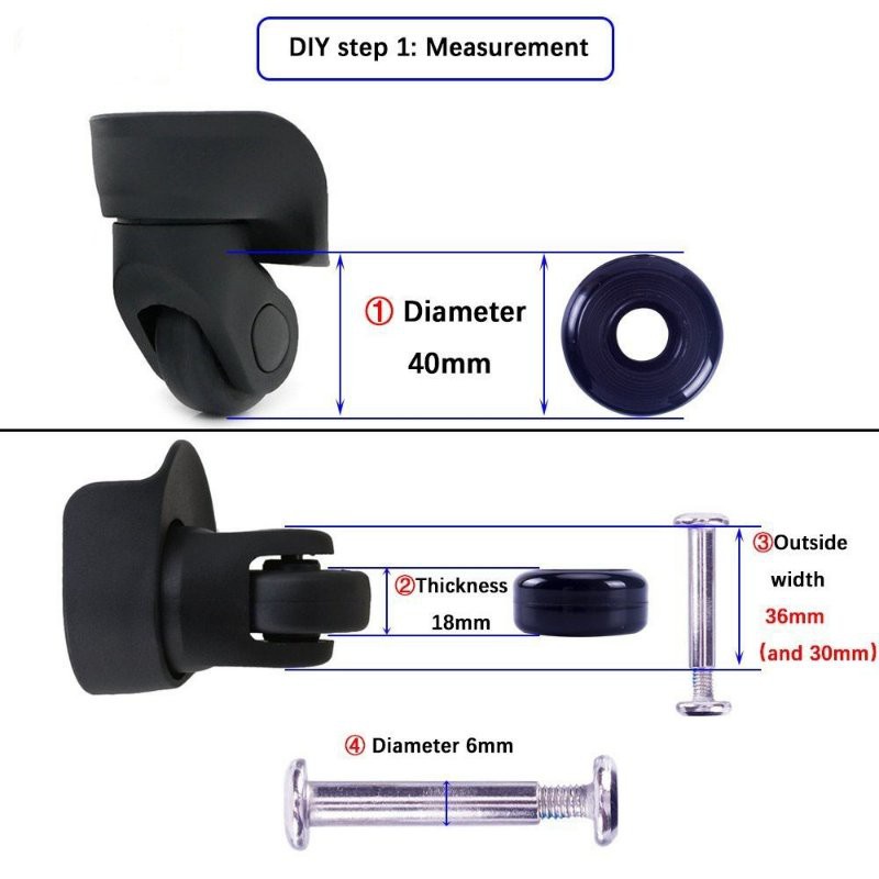 Colour:black Material Quality:good Original wheel was 15mm, but able to fit 18mm just nice for my samsonite. Need to either saw off the wheels or drill thru the rivets... took about an hour for using saw. Wheels as good as new now! Great buy!